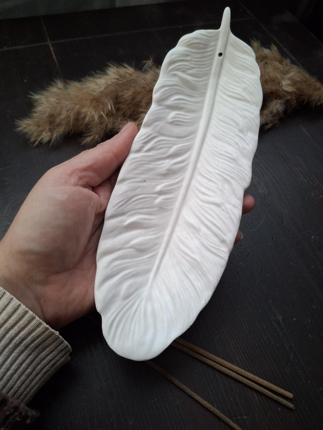 Diese feine Räucherschale in Form einer Feder verbindet Symbolik und Stil auf elegante Weise. Die filigrane Form erinnert an Leichtigkeit, Reinigung und Transformation – genau das, was ein Räucherritual verkörpert.
