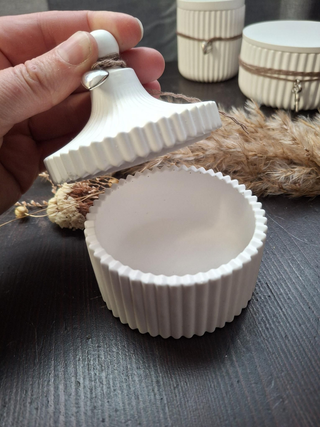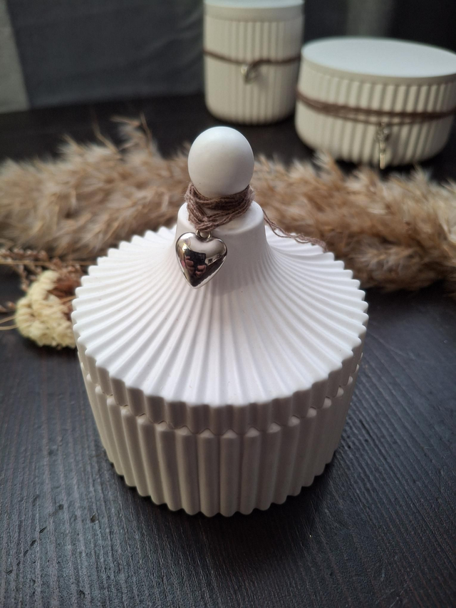 Diese handgefertigte Dose aus weißer Gießkeramik vereint schlichte Schönheit mit praktischem Nutzen. Ob für Schmuckstücke, Haaraccessoires, kleine Erinnerungen oder einfach als dekoratives Element – sie bewahrt, was dir am Herzen liegt, mit Zurückhaltung und Stil.